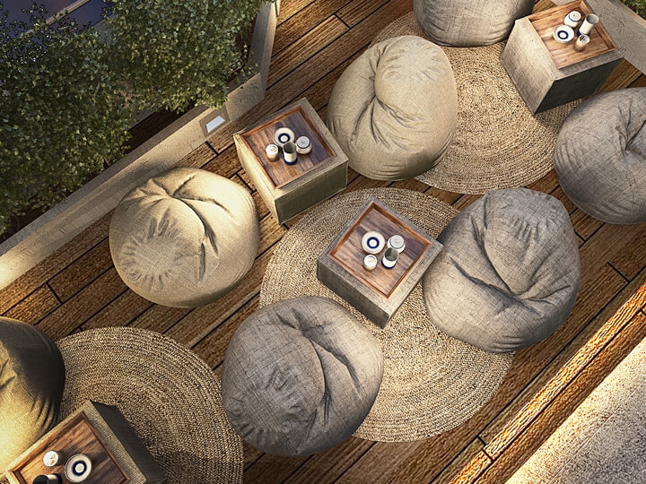 By day, it’s the place to soak up the sun, have a dip in the pool, sip delicious drinks and nibble on some snacks. Night-time is for pre-dinner cocktails in the warm breeze over the swaying trees. With its inviting rattan barstools, plush batik day beds and pillows, this cute little nook is made for group gatherings as well as more intimate poolside moments, and is quickly becoming a guest favourite.